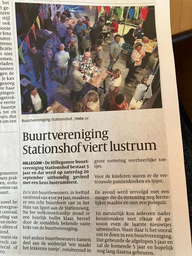 HILLEGOM – De Hillegomse buurtvereniging Stationshof vierde op zaterdag 20 september haar vijfjarig bestaan met een bruisend lustrumfeest in het Huis van Sport aan de Stationsweg. Zo’n honderd buurtbewoners, van jong tot oud, kwamen samen om dit bijzondere moment te vieren.